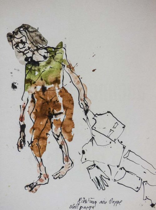 Il importe donc de tenter un premier repérage de ces formes interstitielles de combat ou de lutte telles que Kluge les pense, et les articuler entre elles. La liste n’est évidemment pas exhaustive. Nous allons le faire aujourd’hui à partir du livre Parsifal Container, paru en 2021 et accompagné de dessins de Baseltiz qui venait de créer les costumes et décors pour une mise en scène du même Parsifal qui a eu lieu à Munich