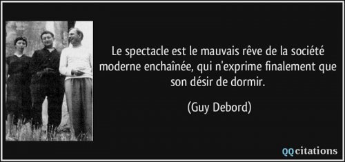 Debord n’aura de cesse de renvoyer chacun non tant à ses chères études qu’à la part de mensonge et de tromperie narcissique assurant à ceux qui sont prêts à y croire le confort de leur psychisme d’esclave, ne voulant que suivre ce qu’on lui dit.