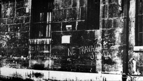 Tout ce que fait Debord ne tend ni à accepter la loi de la séparation qui consiste à considérer que le vécu n’a d’autre finalité que de devenir représentation, ni à utiliser la représentation pour reconduire le spectateur vers son vécu. Ce cercle vicieux, qui nous fait passer d’un vécu exilé dans les images à un vécu retrouvant sa plénitude, qu’à se couler dans les moules que lui offrent le monde spectaculaire et dans les gestes si peu créatifs que lui proposent la publicité et la consommation, il s’agit de ne pas s’y faire prendre, en choisissant comme geste créateur unique un ne rien faire programmatique dont tient lieu la formule célèbre « Ne travaillez jamais ». Mais surtout, c’est à partir de ce dehors très concret et singulièrement inscrit dans le cœur de l’urbanité que ce ne rien faire se constitue de facto en une manière d’attaquer ce monde célébrant l’unité bâtarde de l’ennui et de la marchandise par la médiation obligée du travail.