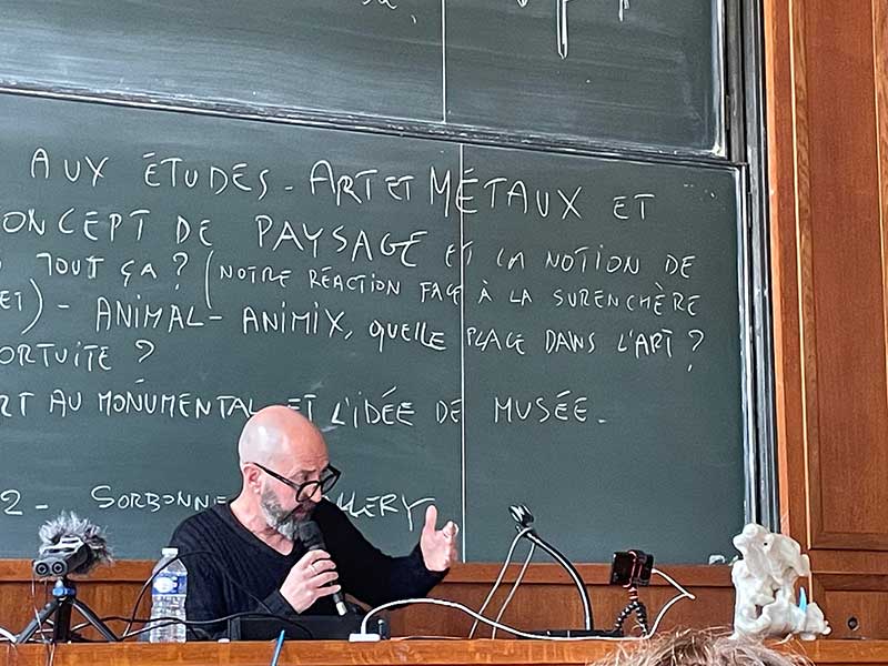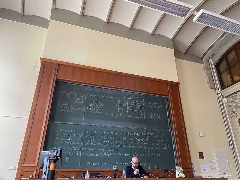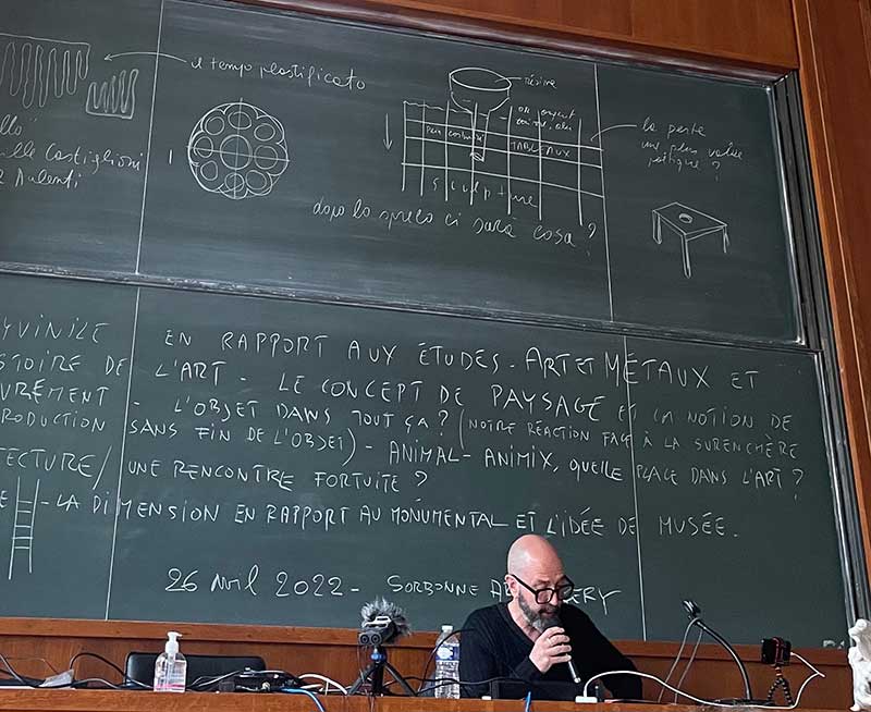 Intriguée par le travail de Faust Cardinali, que je découvre à peine, je me dirige vers la Sorbonne où a lieu ce 26 avril une conférence animée par Yann Toma, président de la Sorbonne Artgallery, ainsi que par l’artiste lui-même. L’université, fermée pour cause d’agitation politique, est totalement vide et silencieuse. Je peine à trouver l’entrée de l’amphithéâtre dans ces couloirs résonnants. C’est alors que j’entends la voix joyeuse de Faust Cardinali, qui me guide jusqu’au petit groupe qui s’est formé autour de lui, et qui l’aide dans les derniers préparatifs avant l’ouverture de l’exposition au public. Un public qui ne sera, malheureusement, composé que de proches de l’artiste, les curieux faisant face à une porte fermée, au plus grand malheur de Faust Cardinali.