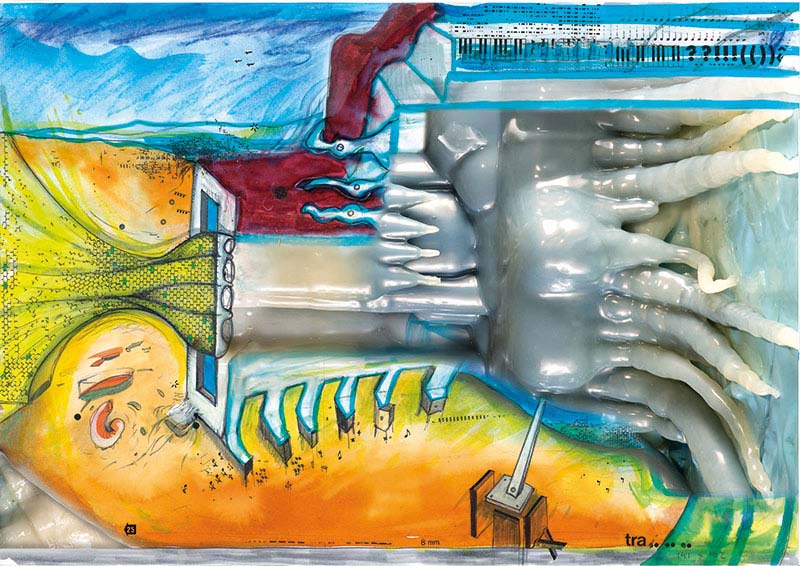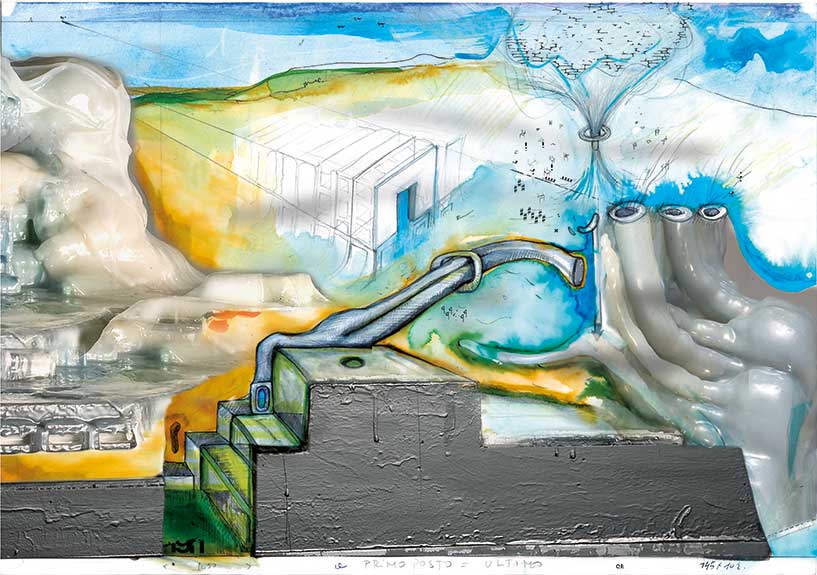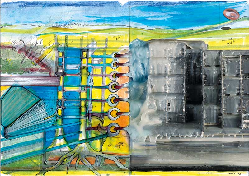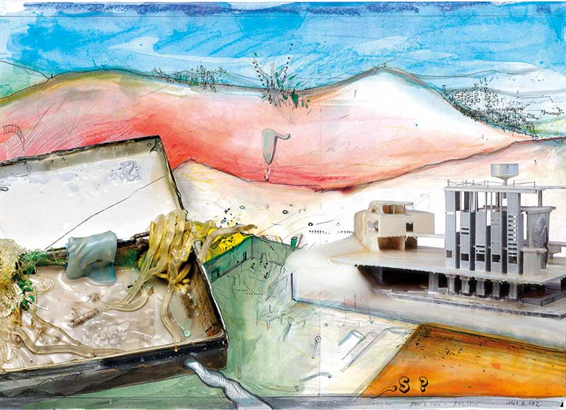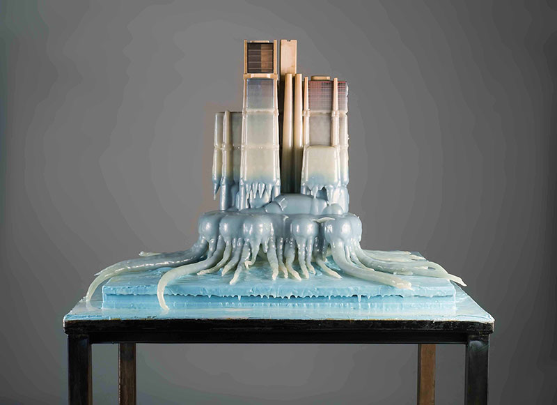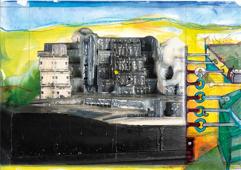 Le polyptyque fait aussi écho au travail passé de l’artiste et à ses liens avec des projets architecturaux : « La maison de l’auteur », une maquette de la maison-atelier idéale réalisée avec un élève de la faculté d’architecture de La Villette dans les années 90 qui au fil des couches de résine successives devient sculpture. Dans l’exposition de la Sorbonne, l’architecture se démembre dans un paysage où la ville est lointaine. Nous devinons la construction, fragmentée dans chaque tableau.