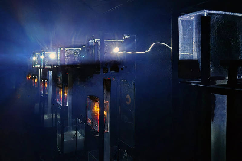 Une étrange machine tout particulièrement scénographiée par la lumière comme par le son se donne en spectacle aux Écuries Lorge. Conçue, puis améliorée au fil de ses résidences par Alexis Choplain, Hydroscope se compose de six unités identiques reliées par une courbe sinusoïdale à l’extrême souplesse. On pense alors au traitement du signal bien que s’en approcher permet d’identifier sa nature liquide qui convoque, quant à elle, la mécanique des fluides. À l’observation de ce qui a l’allure d’une expérience de laboratoire, nous vérifions que la magie de l’eau, sculptée tant par la gravité que par la lumière qui la révèle, opère sur notre perception. Alexis Choplain compte parmi les quelques artistes qui considèrent l’élément aquatique non comme un sujet mais comme un medium à grand renfort de techniques et technologies. Car de tels dispositifs sont compliqués à mettre en place au sein de musées ou de centres d’art. C’est aussi à cela qu’œuvrent les festivals du réseau national Hacnum des arts hybrides et cultures numériques dont les terrains d’action se situent à la périphérie des préoccupations institutionnelles.