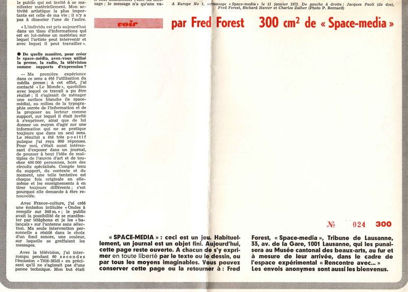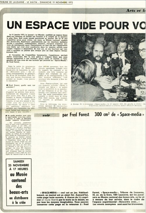 Cette image du trou dans le journal définit parfaitement l’un des aspects majeurs du travail de Fred Forest, qui consiste à investir des lieux ou des espaces institutionnels, journaux, musées, mais aussi parfois la rue, et à les faire fonctionner malgré eux et, en quelque sorte, retourner ce fonctionnement « contre » eux.