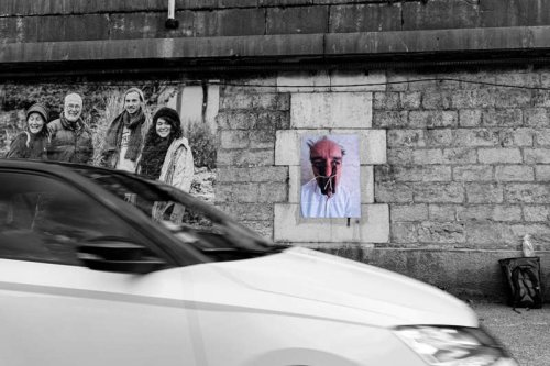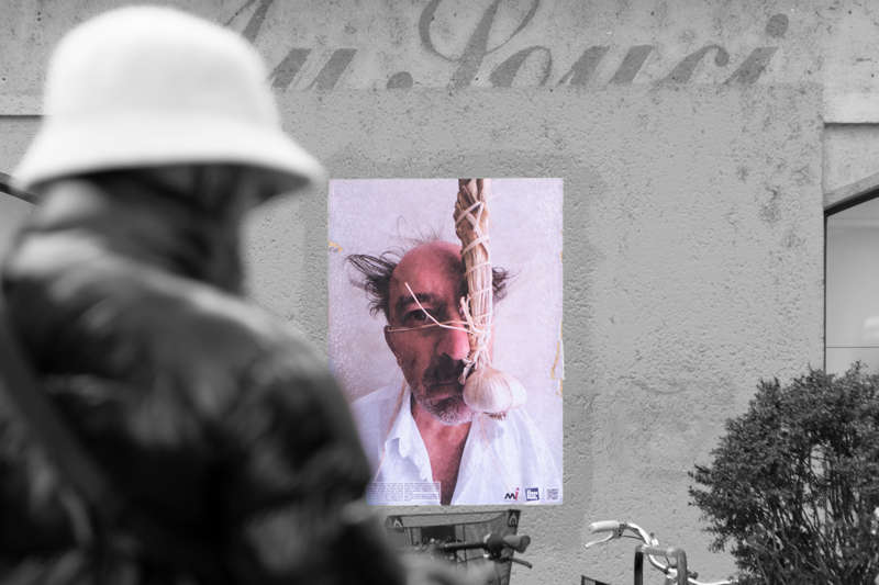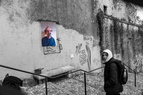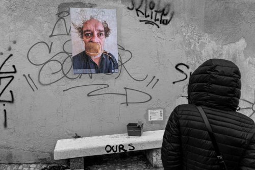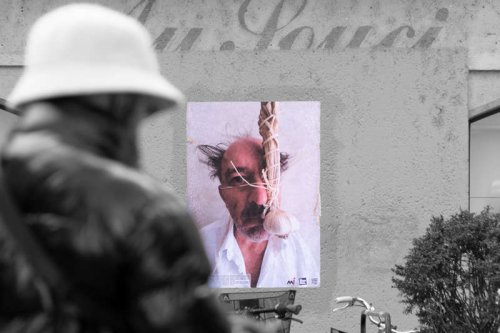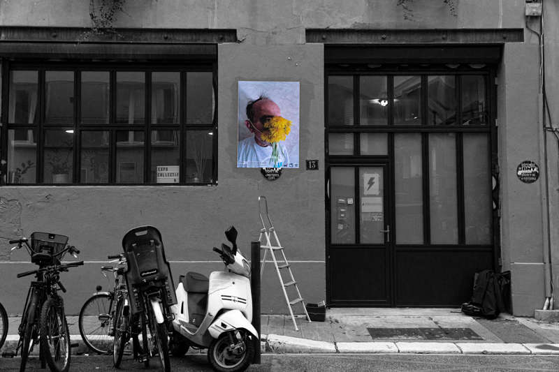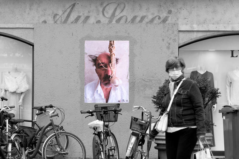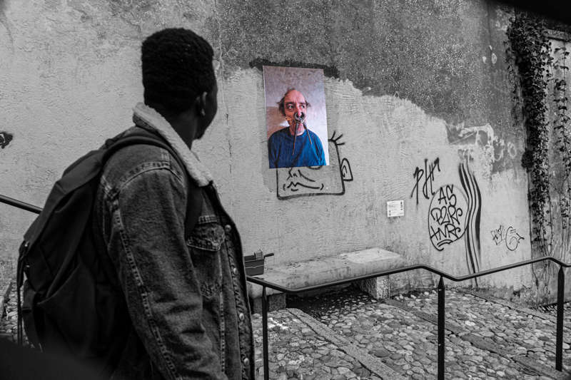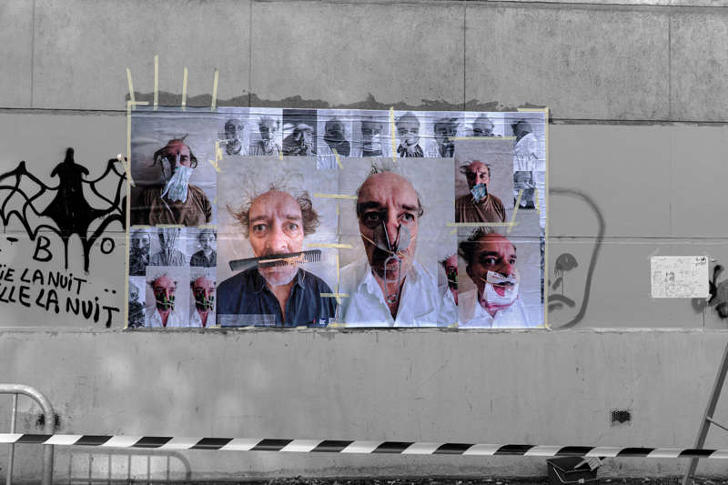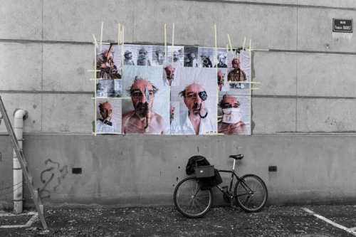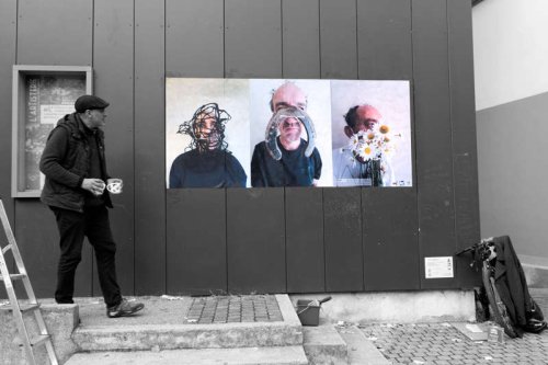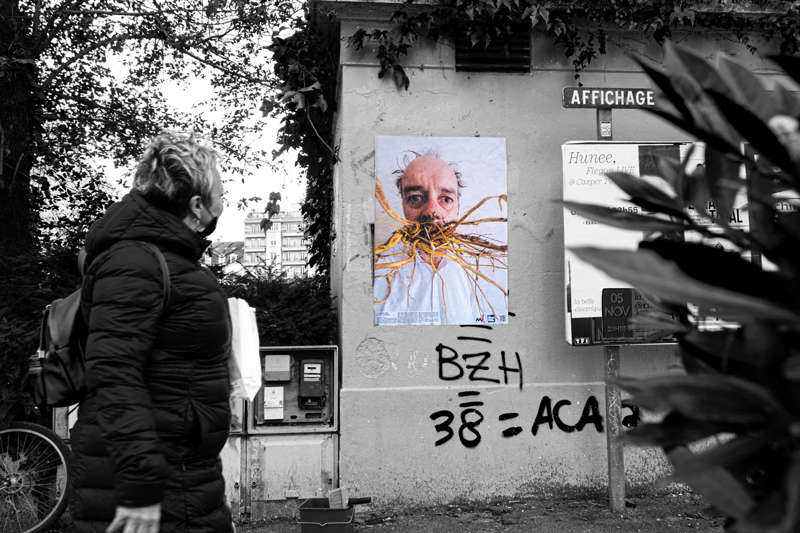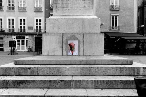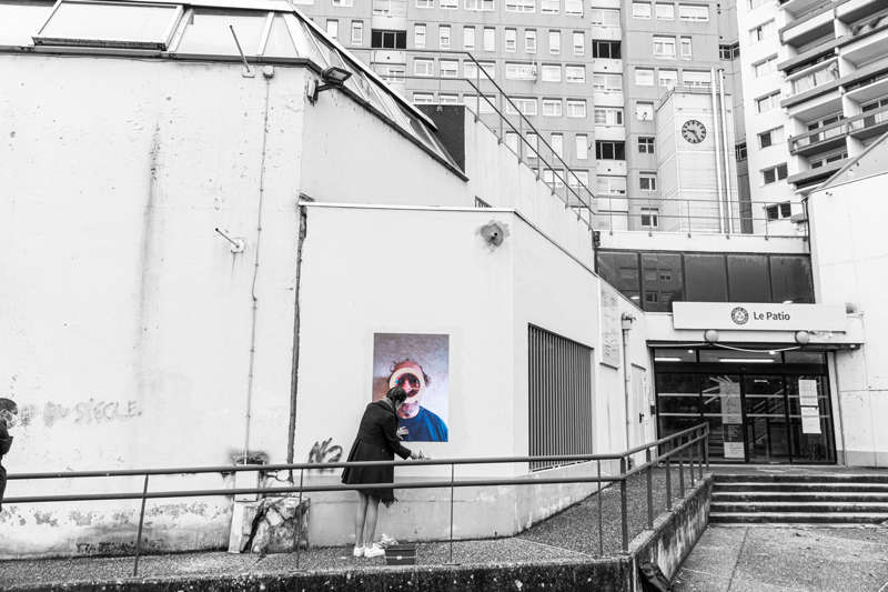 Au début du mois d’octobre, pendant cinq jours, j’ai posé des tirages papier sur les murs et les pierres de quinze rues et places de différents quartiers de la ville plate iséroise. À vélo ou à pied, et avec l’aide de quelques étudiantes de l’école d’art, j’ai parcouru la ville pour montrer les faces clownesques dans des lieux variés qui s’avérèront parfois, par les noms des rues qui commémorent l’histoire, être en résonance tant sur le sujet traité, le personnage montré ou encore plus largement sur la question de la photographie et le traitement des images.