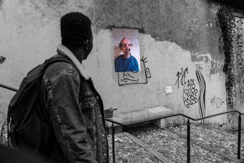 Conversation échangée dans le quartier (la cité) de La Villeneuve. Le fameux quartier à nettoyer au karcher. Pas casher, la rue de l’Arlequin, le bouffon pauvre, rapiécé qui se cache derrière son masque noir. Ici, l’Arlequin collé, portait un éventail pakistanais, le “PakiFan”.