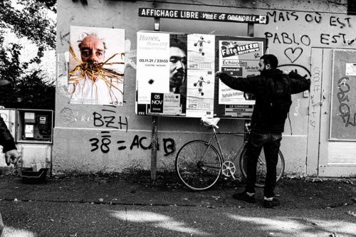 Il y en a eu sur la Place Saint-Bruno, moine savant et ermite installé dans le massif sauvage de la Chartreuse, la farouche “Racine d’ortie”. Quelques collages variés sur le Pont au-dessus du Drac, le torrent contemporain. La place Andry Farcy, du nom du conservateur dégénéré, interné au début des années 40, sur la porte bleue, fermée, du Magasin des horizons. Sur la place Saint-André au pied du plus valeureux des chevaliers, celui sans peur et sans reproche, Bayard. Sur le mur difficile et rose repris par des chinois pour y vendre des habits kitchs et bon marché, un “Aïl”, décollé méticuleusement après coup, d’un ancien magasin de fleur, Au Souci. J’ai rappelé d’anciens souvenirs à un colleur militant qui mélangeait sa colle à des bris de verre. Et puis sur les quais, routiers souvent, de l’Isère. Les deux affiches n’ont pas tenues, emportées par les vents, raclées, rayées, déchirées par les pierres graniteuses des alentours et le passage des véhicules carrossés.
