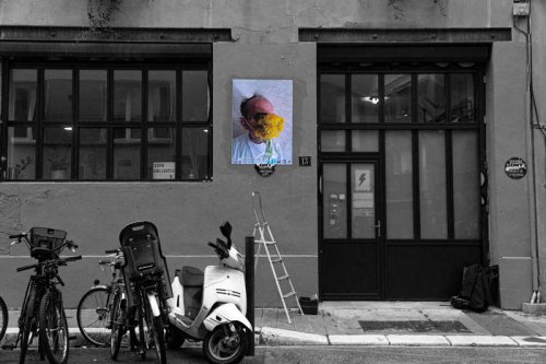 Finalement, les deux grandes compositions majeures de cette exposition extérieure, je les ai réalisées sur les murs dorsaux du bâtiment de l’ESAD, l’École des Beaux Art, bâtiment mitoyen de celui de la PM, la Police Municipale. Je n’ai jamais été autant surveillé pour un collage, pendant des heures fiévreuses et pourtant accueilli et aidé. Là encore dans une rue dédiée à un grand chimiste et physicien, écrivain de lois sur les solutions, principalement chaudes, pas du tout cousin de l’autre actualisé, François-Marie Raoult.