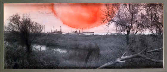 Les taches de couleur, rappellent vaguement des nuages ou un soleil rouge et malsain, font penser en même temps à la pollution chimique de l’air et des eaux. Le trichloréthylène, un solvant de corps gras dérivé de l’éthylène, est une substance hautement toxique et un polluant important de l’air et surtout de l’eau qui menace les nappes phréatiques. Classé carcinogène probable, il irrite la peau et le système nerveux, causant de nombreux cas de maladie professionnelle. L’éthylène fait partie des substances produites sur le site de Lavéra à hauteur de 740 000 tonnes par an. Le photographe se sert ici des effets photosensibilisants du trichloréthylène pour l’utiliser comme liquide transfert.