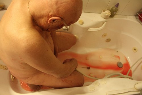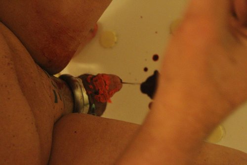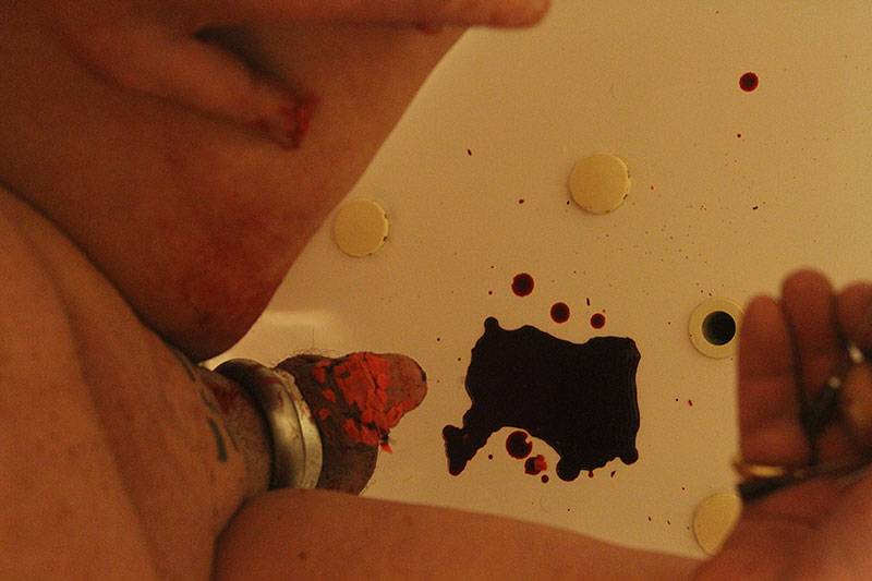 "Cette nuit là, après la cire rouge et les petites aiguilles hypodermiques, j’avais transpercé le gland de Franck avec une grande et longue aiguille, et j’ai voulu prendre en photo le moment où il la retirerait dans sa baignoire. On m’a déjà demandé le pourquoi de cette affection pour le sang qui s’écoule de la chair mutilée, je ne savais que répondre. Je pensais au mythe du saignement de la première fois : cette idée qu’avec la rencontre sexuelle, quelque chose d’intérieur, constitutif, vital, sort du corps et épouse le monde. L’idée qu’il faut fuir du corps pour que le corps existe. Nos séances sont des rituels qui rejouent des mythes, finalement : on pourrait créer celui où le sang de Franck serait aspiré par TK-21, magazine aiguille, magazine vampire, du sang pour le 100. "