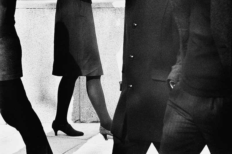 Ville. Ville qui vole en grappes de passants. Ville qui s’étire en solitudes compactes. Au détour des rues grises, je vois la vélocité des pas sur des étendues d’asphaltes. Je vois les arrêts, et je vois aussi les ralentissements que provoquent les signes et les conventions qui balisent la circulation des êtres. Dualisme vitaliste de la quiétude quand le geste est précis et de l’élan brutal de la ville quand le temps semble immuable. Le siècle pourrait être le suivant comme celui qui précède. La modernité, vaste et ouverte reçoit des situations diverses, des combinaisons mêlées, fondues dans le grain épais de la photographie. La texture de l’image se fond avec l’humeur des personnes. La courbure d’un dos soumis au labeur, l’élongation d’un corps qui cherche l’espace de la détente, les contours des gestes d’un groupe de mains dessinent les abords économiques et sociaux de la ville. Le travail, le loisir, la négociation : un carrousel de la vie urbaine, saisi en de minces interstices.