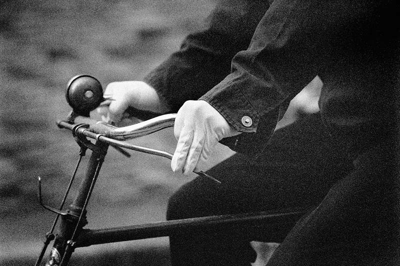 Les bras tendus sur le guidon d’une bicyclette, les mains gantées de blanc, l’anonyme s’élance dans une ville sans nom, sans continent précis. Nimbé dans un flou d’atmosphère, le cycliste est le figurant d’un instantané. Chaque jour, des kilomètres sont ainsi également parcourus. Chaque jour, d’autres personnes répètent elles-aussi les trajets, les gestes et les activités qui les relient à leur ville. La grisaille floutée pour tout paysage, s’épaissit en de tendres laies striées, donnant naissance aux immeubles. La ville ressemble à elle-même. Fidèle à ses motifs, à ses tonalités, à ses sonorités, elle contient l’étendue de son propre répertoire. Celui-ci n’a ni liste, ni ordonnancement. Il est tout entier habité par des index.