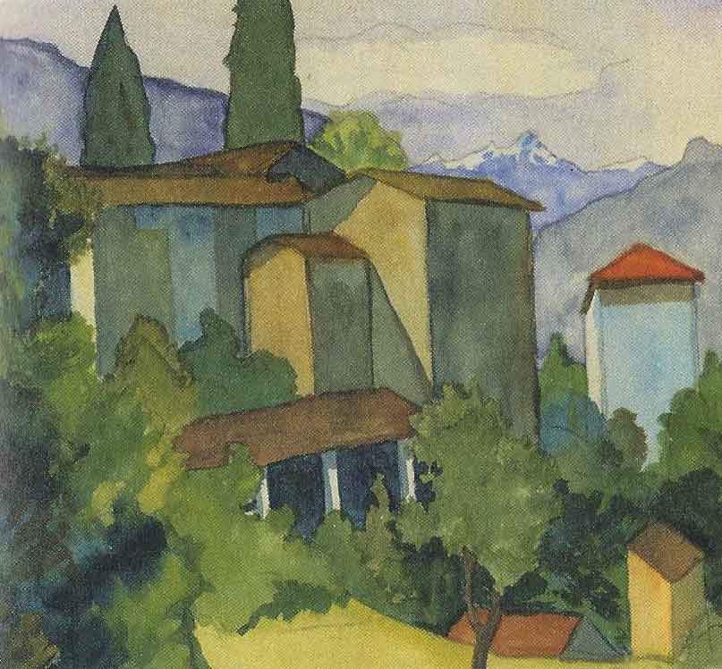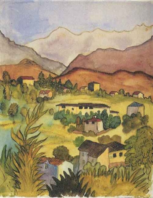 Non pas qu’Hermann Hesse ait atteint aussi facilement, dans ses aquarelles, à la force qui caractérise son écriture, ainsi qu’à la spontanéité souhaitable. Spectateur averti des événements artistiques de son temps, il en a une connaissance certes approfondie ; cependant nous pouvons y soupçonner un handicap autant qu’un avantage. Il reste, au moins dans les premières années de sa production, très dépendant de ses modèles cubistes et expressionnistes. Sans aller jusqu’à les copier de façon servile, il en adopte trop superficiellement les principes : ainsi, pour une Maison cubiste ou un Paysage du même nom, il ne suffit pas de géométriser les formes pour se conformer à l’esthétique cubiste. Il en va de même pour ses sympathies envers l’Expressionnisme : le rendu d’un motif par plans superposés jouant sur les effets de transparence nous rappelle trop la manière d’un August Macke, d’un Paul Klee ou encore d’un Feininger ; il est vrai qu’à travers eux, c’est de son ami Louis Moilliet [22] qu’il cherche à se rapprocher. Il est permis de n’accorder qu’une place modeste à ces réalisations qui, malgré le charme qui s’en dégage, demeurent quelque peu scolaires. Plus convaincantes sont celles où les formes se resserrent, se densifient et où, par voie de conséquence, les couleurs se regroupent pour présenter des contrastes de complémentaires. Certaines vues des villages du Tessin rapprochent alors les travaux d’Hermann Hesse de ceux de Gabriele Münter, ou même de Kandinsky (dans la période qui précède chez lui son saut dans la pure abstraction).