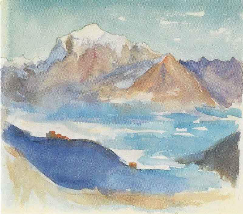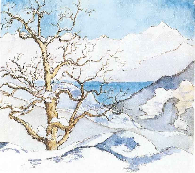 Certaines vues d’hiver des montagnes du Tessin en portent un incontestable témoignage. Les reliefs apparaissent à demi noyés sous la neige, comme si les formes étaient animées d’un double mouvement, d’inspiration puis d’expiration. Les réserves aménagées entre les zones colorées – entre le bleu soutenu du premier plan et le rose léger du lointain – accentuent cet effet. Ces réserves sont davantage que des intervalles : il faut les recevoir comme des pauses, au sens musical du terme, comme des moments de respiration avant des « reprises ». Elles sont la respiration enfin libérée d’Hermann Hesse lui-même, dans l’échange apaisé entre le moi et le monde, dans la contemplation sereine de l’Immense.