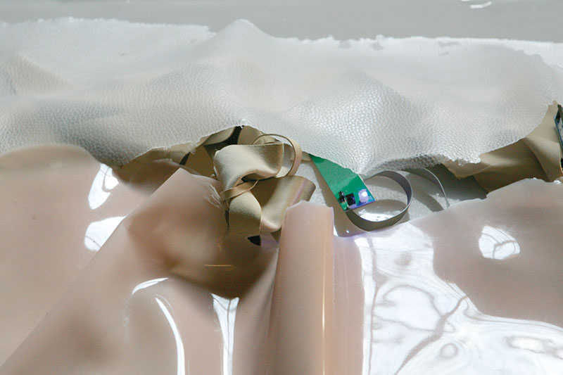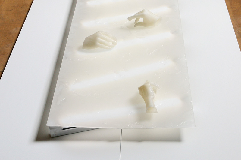 L’intrusion de ces techniques dans la sphère domestique se prolonge aujourd’hui par leur infiltration épidermique. L’interface, manipulée par les utilisateurs, les informe en retour et participe directement à la production de leur subjectivité. Plus besoin d’architecture ni de chimie : la membrane digitale se charge de nous faire éprouver la sérénité béate en sa présence, le manque déchirant en son absence. D’abord, nous pensons utiliser cet outil nouveau mis à notre disposition comme n’importe quel autre – la leçon d’Hannah Arendt, enseignant que l’outil n’est jamais que le prolongement de la main, ayant manifestement été entendue. Puis, nous nous rendons compte que nous en somme le sujet addict plutôt que le maître et possesseur : une certaine gestuelle s’est ajoutée au vocabulaire corporel, comme le montre l’installation Futur Instant, moulage de gestes gelés en train d’effectuer ces « swipe » ou « scroll » si absurdes hors contexte. Ce qui se passe alors n’est que l’aboutissement de la prophétie déjà entrevue avec la Playboy Mansion. A propos de l’appareillage technologique de la Mansion, équipée de téléphones, de sonnettes d’alarme, de systèmes de surveillance et de haut parleurs, Beatriz Preciado décrétait déjà : « dans la Playboy Mansion, nous sommes plus proches de l’organisme technologiquement assisté de John McHale, Buckminster Fuller ou Marshall McLuhan : les écran-yeux de la maison ne sont plus des organes mais des prothèses médiatiques » [3]. L’étalage de peaux que l’on voit dans l’installation Nude, toutes de tons beiges, où le synthétique et l’organique semblent s’être adonnés à des alliances contre-nature, lui donnent raison. On passe alors de la biopolitique, envisagée comme dissoute dans le corps, à une relocalisation en surface d’épiderme, cette zone de contact qui entraîne à la fois addiction et satisfaction face à la machine-matrice. Le corps sans organes de la modernité s’est transformé en organes sans corps. Ou plutôt, en un seul et ultime organe qui les totalise tous : l’interface.