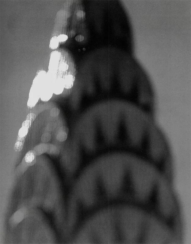 Il y a des silhouettes qui percent à travers un quasi-brouillard, des formes très vagues qui assurent une vraie présence quand même et qui font dire oui c’est bien cela, car ce qui est retenu ici c’est vraiment l’essentiel, l’esprit de la chose plus que la chose elle-même, l’essence de la chose. Tout y est, ou presque, et parfois bien au-delà aussi. La lumière qui signale, qui souligne, qui désigne, qui révèle. Des taches de lumière sur les écailles ou le rostre des flèches des gratte-ciels de New-York, Chrysler Building, Empire State Building, des convergences ou des ondes de lumière dans les nefs des églises ou des chapelles, Chiesa Rossa de Milan, Chapelle Saint Benedict de Sumvigt, des nébuleuses descendues du ciel ou des soleils accrochés au-dessus des autels, Woodland Chapel de Stockholm, Chapelle de Notre-Dame du Haut, une croix de lumière seulement pour la Chapelle de Ibaraki, lumière géométrique, comme découpée à l’emporte-pièce, portes et fenêtres intérieures du siège de D.E. Shaw and Company, vibrations des facettes de l’atrium de verre du Tokyo International Forum ou du Kunsthaus de Bregenz, Rockfeller Center saisi de nuit comme une fusée géante « Saturn » s’arrachant du sol, trois verticales de lumière, ou une large bande horizontale pour résumer la maison Schindler de West Hollywood, lumière toujours dessinant les fenêtres buccales à colonnes d’os de la Casa Batlló à Barcelone…