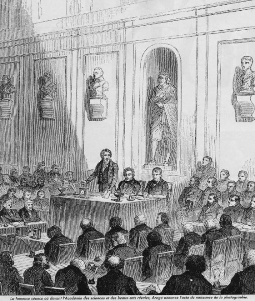 La communication de François Arago eut lieu lors de la séance publique de l’Académie des sciences du 19 août 1839, comme le montre la gravure de Louis Figuier, dans la salle qui accueillit ce colloque le 15 décembre 2015.