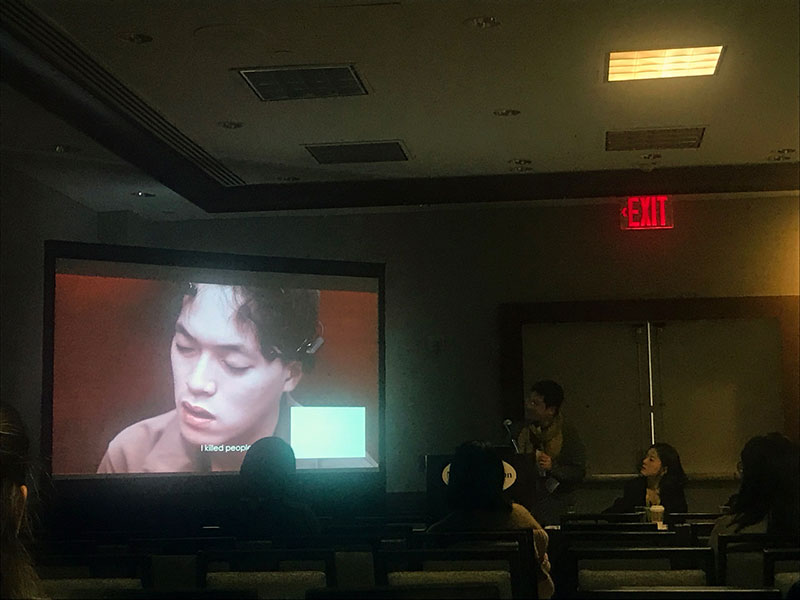In the video, the actors read the letter, and each sentence is followed by a short sequence of pictures of the Korean War being projected on smoke. I used smoke due to their very nature of ephemerality in relation to the concept of memory. Memory is an event of the past, but the memory stays around one’s mind even though it is not out there anymore. Sometimes big social memories like wars stay in people’s minds from generation to another generation, and they affect human behaviors. For me, I was born in 1984 which was almost 30 years after the Korean War. Since two Koreas are still divided, the trauma of the war still exists.