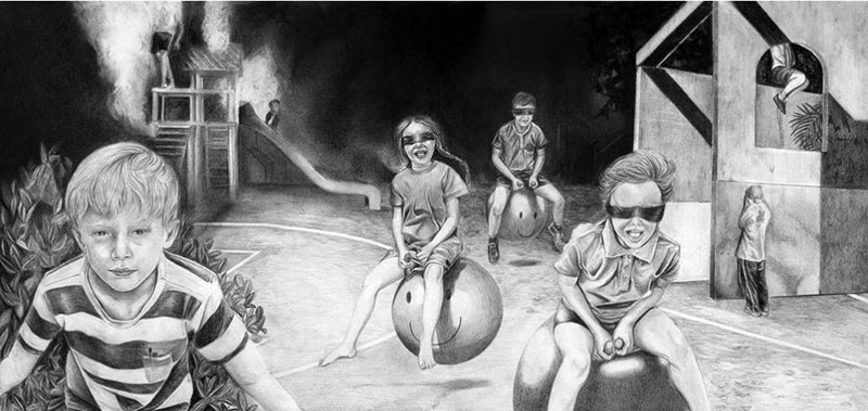 Nous avons pensé la sélection des pièces, essentiellement du dessin, au crayon, fusain, feutre, stylo, pastel, mais aussi de la gravure et de la peinture, selon ce qu’elles portent en elles du hors-champ les unes des autres, comme une possibilité de réponse à une question non formulée ou comme une piste élaborant un jeu de cache-cache, un chemin mais aussi un inconscient, amenant à d’autres images ayant elles-mêmes leur point de fuite, leur manque ; en somme ce que les manques se répondent entre eux, comme un dialogue des solitudes, ce qui émerge d’entre elles, ce qui gratte, ce qui s’imprime, laisse des traces par ce qu’elles excluent mais aussi ce qu’elles gardent affectueusement en elles, c’est-à-dire un espace d’identification, des normes sociales à la contemplation isolée de la nature, la jouissance portant ces dernières, parfois morbide, parfois érotique, attentionnée au regard de l’autre (humain ou non) légitimé par son propre regard ; mais une jouissance aussi portée par son effacement, par la grimace de sa chair, l’essoufflement de la mémoire, le retour du trauma et de ce qu’il contient qui ne peut être énoncé ; en cela ce qui est hors-champ, dans sa dialectique, peut être nommé consolation, ou mieux encore une vitalité qui dans sa force invisible sous-tend ce qui tient debout, guide la main, esquisse la nouvelle image, le contour du nouveau dessin.