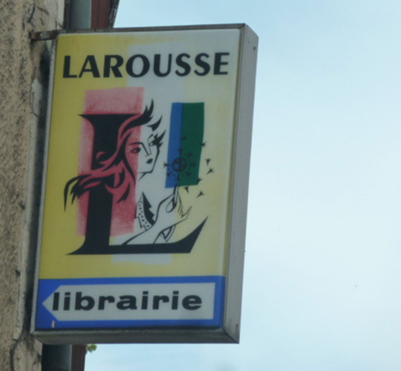 Parfois sur la grande avenue je contemplais l’enseigne éclairée de Larousse comme une réplique magique, un double immense et volumineux du carton imprimé que le vieux libraire m’avait donné, un reflet du petit carton replié dans mes doigts. C’était le profil de cette femme irréelle qui m’apparaîtrait bien plus tard comme un concentré de dessins d’un Mucha, enveloppée elle-même dans les formes esquissées de ses cheveux flottants. Dans ses mains effilées, des dessins et des lettres de l’alphabet se mêlaient. Pétales, feuilles ? pollens, vents et poussières d’Europe ? Elle les déployait sur la rue, sur les heures, sur les lumières, sur le langage semblait-il, sur ces lettres qui flottaient, sur les villages et les villes de France dont je ne connaissais que les noms, Marseille, Paris, ou La Rochelle enfin dont parlait tant mon père, avec sa « tour des quatre sergents », un monde de mousquetaires, de cardinaux aux robes écarlates et d’épées, comme des dessins de fleurs et de lettres effilées, telles celles des enseignes en anglaises des pâtissiers, de reliures dorées et de livres précieux.