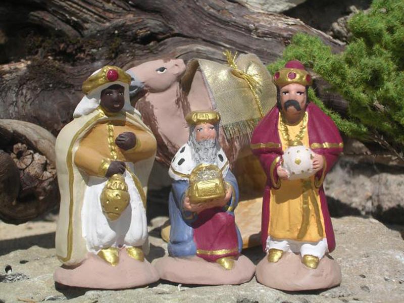 Les petits personnages alignés des rois mages flamboyaient ainsi dans mon imagination, à moitié princes, parés de morceaux de velours et des losanges de tapis d’Arabie, à moitié silhouettes furtives entrevues et se fondant dans la Médina disparue. Esprits malins, bons et mauvais génies, personnages des récits et des illustrations, dessins, figures exorbitées de jeux de cartes et des boîtes en couleurs du Nain Jaune, parfois formes débridées et folies des matières de la nuit, des orages, des terreurs et des songes, les petits personnages se tenaient alignés devant la crèche, fixes et lancéolés des mystères de leurs pays lointains, de contrées sans fin traversées, d’ors, de parures et des nuits étoilées. Et il n’était dans leur sillage que de belles formes d’orient, ainsi que dans leur file, et comme les surplombant de sa hauteur, un chameau se dressant, légèrement velu, chargé de coffres précieux et de parures, avait un pelage duveteux collé sur le plâtre comme celui du bœuf et de l’âne, mais qui pour moi devenait plus feutré, comme d’une autre nature, par le dépôt de poudres du désert, de chemins parcourus pour des cadeaux portés, depuis une Perse lointaine et par tous les voyages accomplis.