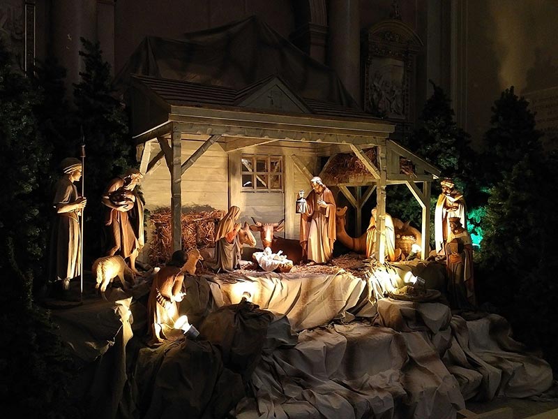 Les sujets de Noël se déployaient devant l’entrée de la grotte, drapés, agenouillés parfois, les mains croisées sur la poitrine, avec Marie, la mère de Jésus d’un côté, et de l’autre la petite statuette de plâtre peint de Joseph, le très étrange nourricier, et dont le titre de « charpentier » semblait édifier à lui seul un mystère et un monde. Tous deux se tenaient, fixes, autour du centre dense et vide du personnage absent, du nouveau-né, foyer de Noël comblé déjà et connu de tous, flottant dans sa sorte de nuée des récits comme dans l’infinie justesse et l’infinie architecture du papier-grotte de la crèche agencée par mon père, dans la répartition savante enfin de tous les personnages attendant.