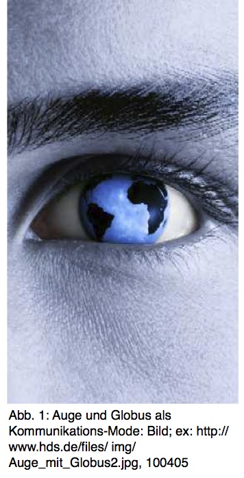 Der Globus ist, anders als die Welt, ein Objekt. Wir sind in der Welt, doch wir blicken auf den Globus. Und mit ihm : Die Kugel vor unserem Auge korrespondiert der Kugel, die das Auge selbst ist. Das Bild erhielt mit der Verbreitung des Internet und seiner Mediatisierung enorme Präsenz. Kaum ein Unternehmen, kaum ein Plakat, das im ausgehenden 20. Jahrhundert nicht entweder Auge oder Weltkugel oder beides miteinander verschmolzen darstellt (vgl. Abb. 1). Mit Anbruch des Kommunikationszeitalters seit Mitte der 80er Jahre sind neben der Netz-Metaphorik (vgl. Sennewald 2004) Globus und Auge die prominentesten Sinnbilder der öffentlichen Kommunikation geworden.