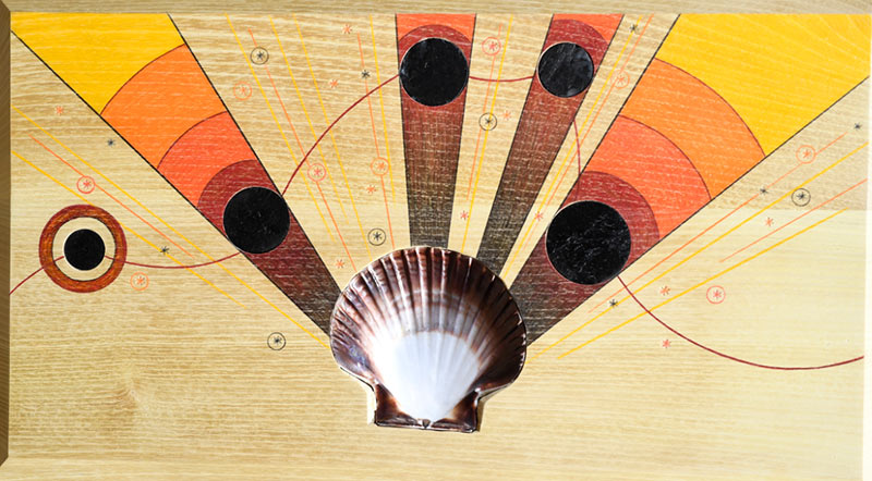 Pour soigner la terre et les âmes de la mine à Decazeville, Sandra Lorenzi a créé une série d’œuvres dont « Les corvivances », panneaux de bois peints et gravés incrustés d’une coquille St. Jacques dont les vertus régénératrices sont connues des pèlerins depuis longtemps. La coquille St. Jacques serait un objet énergétique et vibratoire hors du commun. Notamment par sa structure harmonieuse et équilibrée qui repose sur le nombre d’or. Elle est associée à la fertilité, à la dynamisation, à la protection ou au nettoyage énergétique, notamment des minéraux. Ces propriétés peuvent aussi opérer à travers l’écran de votre ordinateur en contemplant l’œuvre devant vous. Elle augmentera alors peut-être votre taux vibratoire.