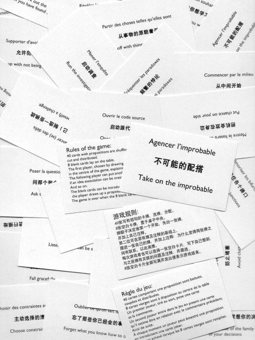 À la page 27 du numéro zéro un deux, des cartes qui semblent de visite promettent des rencontres en s’étalant en phrases-questions et lancent des appels au jeu en une vision chinois-anglais-français du monde, portant des mots qui rappellent les heures perdues d’une jeunesse qui ne passe pas : « Agencer l’improbable / Poser la question / Fall gracefully / Mettre le hasard de son côté / Commencer par le milieu / … »