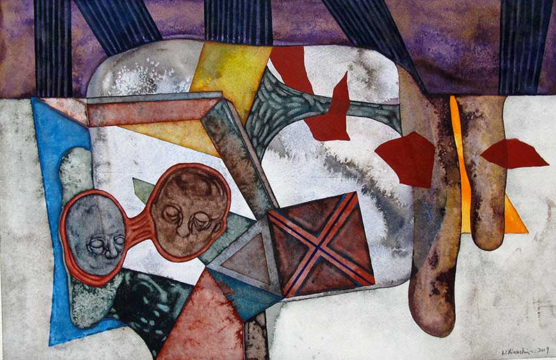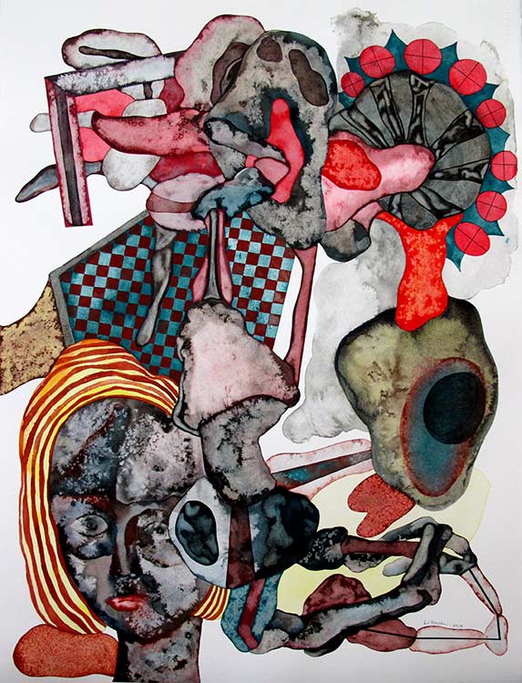 C’est pourquoi intrigués au premier regard et ne reconnaissant rien, nous sommes emportés par le doute, non sur ce que l’on voit mais sur nous-mêmes lorsque nous comprenons que chacune de ces aquarelles est une tentative de dresser notre portrait. Il faudrait dire « portrait en creux », car c’est de l’envers du masque dont il est question ici.