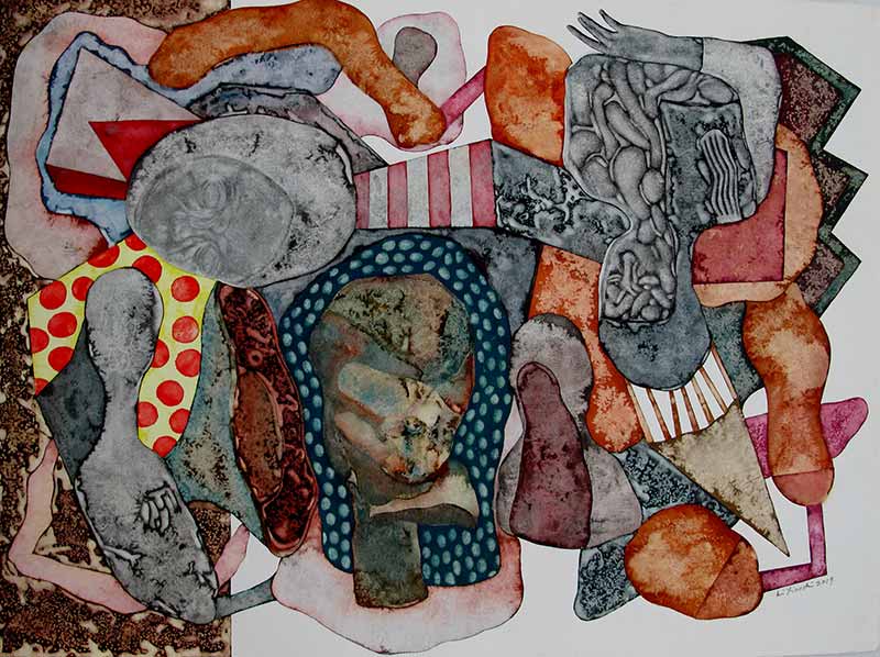 C’est dans cette zone que nous conduisent les œuvres de Li Xiaoshi, là où la confusion règne mais où le détail surgit, incomplet mais révélateur. Ainsi voyons-nous apparaître des fragments de corps à la fois dispersés et rassemblés selon une logique qui n’est pas celle de la nature. Des morceaux d’organes semblent en quête d’un corps pour les contenir et dans leur errance laissent entrevoir des liaisons qui dépassent et la nature et la raison mais qui évoquent ces agencements psychiques d’images que les rêves font surgir dans le sommeil et parfois quand nous sommes à-demi éveillés.