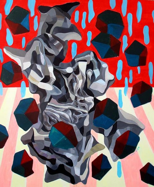 D’autres éléments viennent se mêler à cette débauche organique. Ils sont plutôt à tendance géométrique. Fragments de surface non identifiables, lignes reliant des éléments semblables ou disparates, faisceaux de lignes dessinant une figure mathématique ou une sorte de forme architecturale, grilles de lignes assurant à des échos d’objets sans fonction réelle une forme de légitimité existentielle, tout ce qui peuple ces aquarelles et ces toiles existe à la fois comme un élément d’un rêve et comme la forme d’un projet non identifié mais réel puisque offert, là, à notre regard.