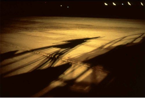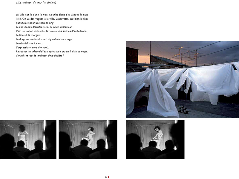 Dans « Ce qui est passé par ici, qui repassera par là », Éric Audinet [2] associe à une série d’images proposées en polyptyques neuf sentiments, selon sa définition dans le vocabulaire de la chasse : « l’odeur de la bête, qui demeure après son passage ». Neuf micro-récits sont ainsi tissés de ce qu’il reste du regard sur cette série d’images, un élément visuel, une couleur, dans son sens le plus riche – une atmosphère. Chacun résonne en écho, plus ou moins décalé, toujours distancié notamment par le ton du narrateur-observateur déroulant de vrais/faux souvenirs – la plupart des textes déclinent des références cinématographiques ou littéraires, de Destination Zebra station polaire à Cassavetes en passant par Madame Bovary – et le Guide bleu Hachette… En point d’orgue, peut-être, le « sentiment du monde pas encore commencé » : finalement, « rien encore n’est arrivé ».