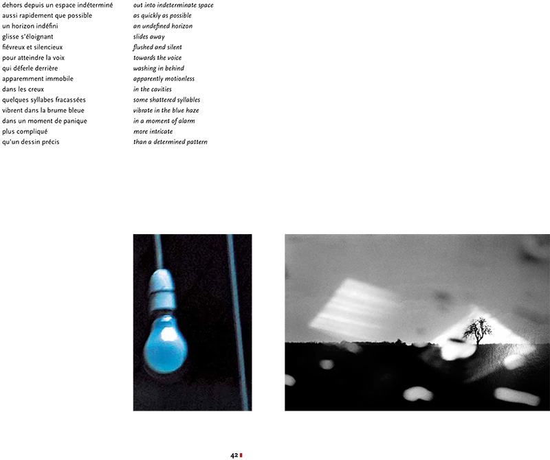 Comme une boutade adressée à Éric Audinet, Tom Raworth [3] intitule sa série « Pense un titre »… C’est sur un rythme staccato, un phrasé en notes détachées (ou « piqué »), qu’il répond aux photographies proposées en diptyques cette fois, toutes relevant très clairement de la vanité (négatif rayé, carcasses de boucherie suspendues à des crochets, nu courant entre les arbres comme suspendu dans le temps…). De courts vers, très sonores (il nous a semblé important de donner, en regard de la traduction de Marie Borel et Jacques Roubaud, la version originale anglaise en ce qu’elles ont, forcément, chacune leur « musique »), « quelques syllabes fracassées » à la fois sans attache et intimement reliées aux images, qui disent les débris, les rebuts, les traces, les reflets, la chair vivante et morte, bleu glacial et rouge feu, les griffures du temps, « la radiation d’un éclair orange / englouti dans le vide », l’« étoile éteinte / disparaissant dans le noir / souriant à la tête de mort ».