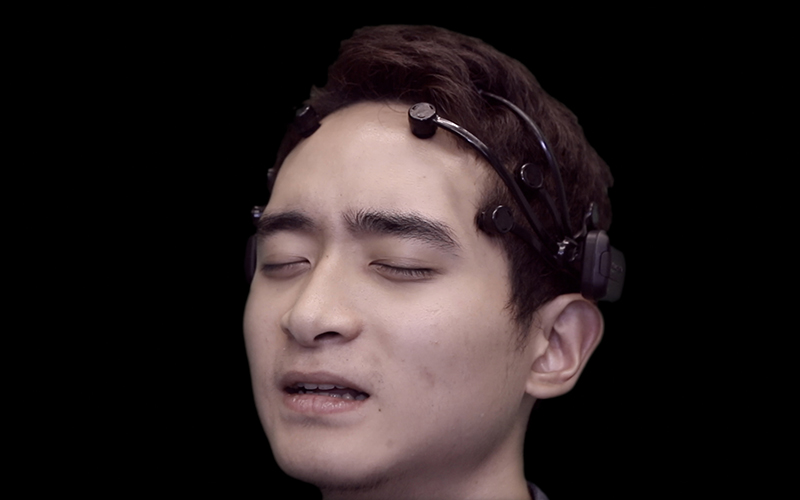 So, to answer your question, I want to show the emotional (or subjective) and the scientific (or quantitative) responses of these actors simultaneously. The act of convincing here plays a central role. Through its visualizations of neural activity, the EEG technology convinces us what has been unverifiable through action alone. For instance, I made a similar video with other actors without using an EEG. The main difference using this device is that the recording generates visible, measurable and thus verifiable outcomes. It reveals what has been hidden from our general senses. Without the machine, you can’t easily say whether the actors really feel something or not. But with it, you can say that they really feel it. The brainwaves being captured seem objective while the actors’ facial expressions seem quite emotional. I link the subjective and the objective together, creating a sense of antithesis. The actors are not only subjects who express emotions but also objects being measured and observed.
