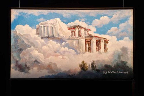 Enfin, il y a les peintures du collectif Obvious connu pour son usage artistique de l’intelligence artificielle générative s’articulant autour de la formule qui orne leurs toiles. Il y a Le Phare d’Alexandrie et Le Temple d’Artémis à Ephèse, deux des Sept Merveilles du monde. La machine a donc été au service de l’humain, qui l’a programmée pour générer des images selon des textes anciens, afin qu’un humain exécute des peintures à l’huile selon l’esthétique préalablement envisagée par la machine. C’en est fini de la dichotomie visant à nous séparer des programmes qui nous prolongent désormais en tout, pour le meilleur comme pour le pire. Aussi, nous nous devons, plus que jamais, d’encadrer de telles collaborations. Pour que l’expérience soit complète, il convient d’observer les animations qui augmentent ces deux merveilles du monde au travers de l’application de réalité augmentée Artivive. Ces animations sont semblables à celles qui se poursuivent en ligne sur la plateforme NFT Superare. C’est là l’une des réussites de cette exposition à l’étonnante unité de style : parvenir à mêler les formes esthétiques les plus diverses.