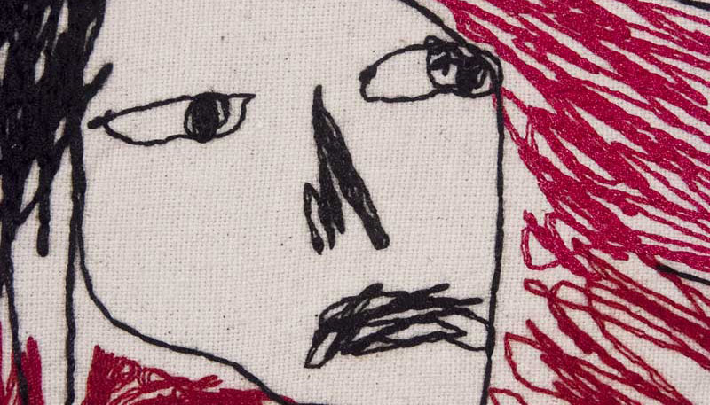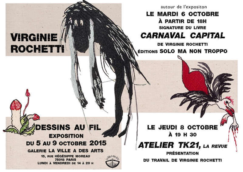 Longtemps active dans le monde de la scénographie, de la performance et du théâtre expérimental, Virginie Rochetti se consacre depuis quelques années à une œuvre qui s’origine dans une pratique « brute » du dessin et se déploie, au gré du bruit des aiguilles qui cliquettent, celles qui s’excitent sous l’action de mains invisibles lancées vers la toile à grande vitesse par les mécanismes de sa performante machine à broder.