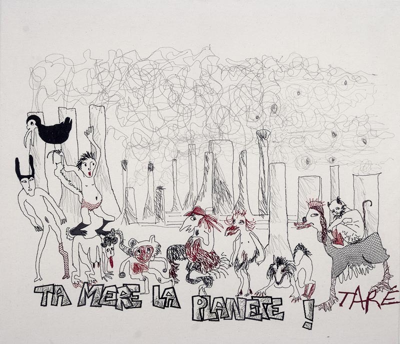 Les broderies sont souvent accompagnées de mots et les mots se sont mis à prendre de plus en plus de place dans l’univers figural qu’elle déploie. Il faut bien les entendre ces mots car ils sonnent comme des cris, comme des aveux d’impuissance mais aussi comme des révoltes absolues. Et aussi, le plus souvent, comme des petites bombes d’ironie portative permettant de mettre en pièce un pan de nos croyances. Les mots ici sont des cris lancés au-devant de rien adressés à personne mais que chacun peut entendre.