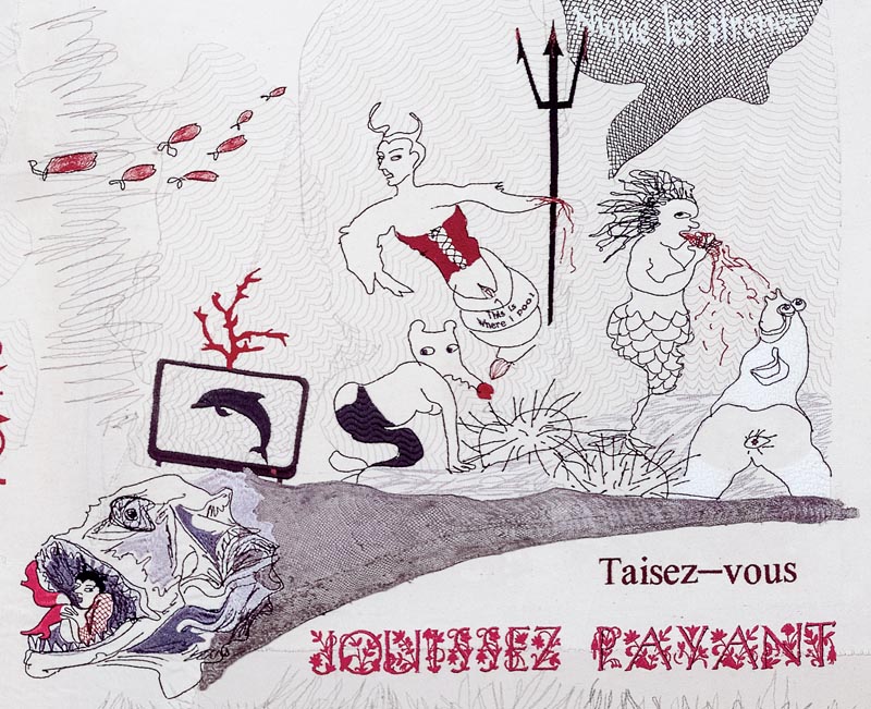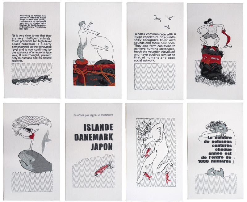 Ces peaux brodées sont accompagnées de dessins eux aussi brodés dans lesquels les mots deviennent plus envahissants. Les textes se font aveux d’impuissance et cri, manifeste et dénonciation. Mais sachant combien vaines sont les protestations non répercutées par les mégaphones des pouvoirs en place, elle déchire l’évidence du trait de l’ironie, conférant par exemple un nom à chacune des peaux de ces loups marins dont elle a un fragment de peau, transformant ainsi ce silex en pierre tombale et le nom et la date inscrit en une épitaphe non seulement des baleines mais de l’humanité entière.