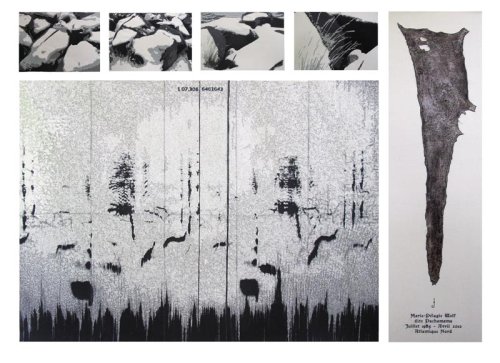 Ayant rapporté des fragments de peaux de Wolffish (Anarhichas lupus) dont la forme évoque à la fois l’épée et la hache, le fourreau et une sorte de chapeau pointu, mais surtout les silex des temps d’avant l’histoire fatale de l’humanité malade, elle a entrepris de les coudre et de laisser courir dessus les aiguilles de la machine à broder, dessinant ainsi une carte improbable des migrations impossibles des baleines hors du monde où elles se font exterminer.