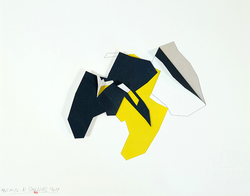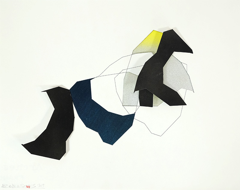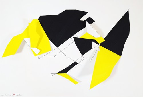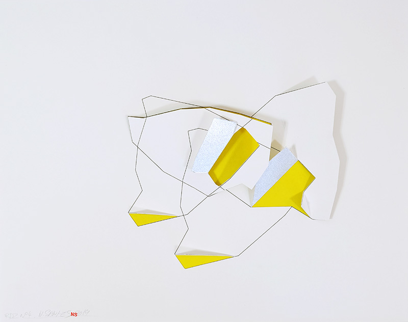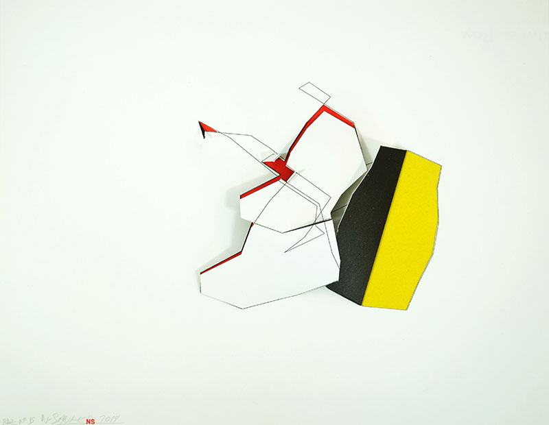 Sur des feuilles blanches des lignes dessinées se voient par endroit doublées par des lignes découpées. Elles donnent lieu à des soulèvements de surfaces qui ressemblent à des apparitions de plaques tectoniques à échelle miniature. Mais ces découpes révèlent aussi des arrière-plans singuliers. En effet, on voit paraître divers modules colorés qui relèvent parfois du fond, parfois de la face cachée du papier qui sert de support à ces variations créatrices, parfois de l’ombre que laisse un plaque qui se soulève.
