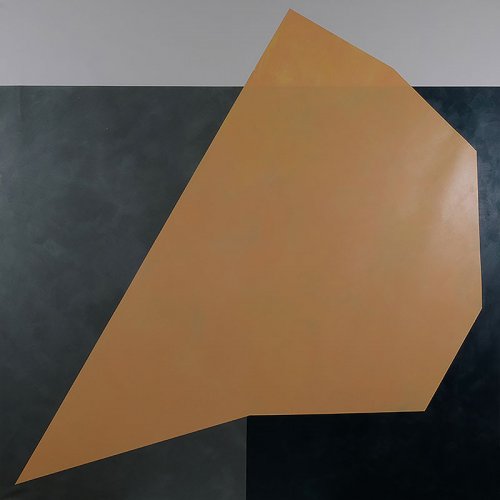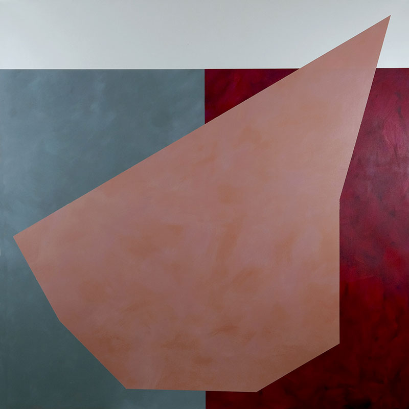 La forme, ici, se présente donc à la fois comme découpe et emprise. Elle définit un monde et dans ce monde, des variations vont pouvoir advenir. Mais cela ne vaut que pour deux des six toiles présentées ici. Dans un autre ensemble de deux, la forme vient se poser sur deux pans de couleur dont elle déborde en quête d’une possibilité de repli comme s’il s’agissait de les absorber.