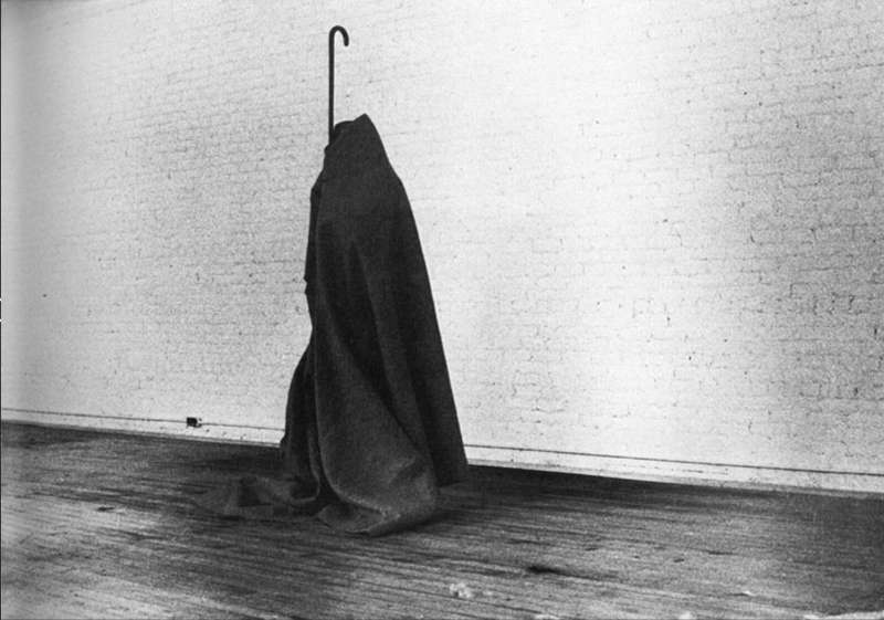 Enveloppé dans sa couverture de feutre, Beuys se fait sculpture animée, tantôt verticale la canne sortant par le haut, tantôt pliée canne vers le sol ou accroupie canne en l’air puis canne vers le sol.