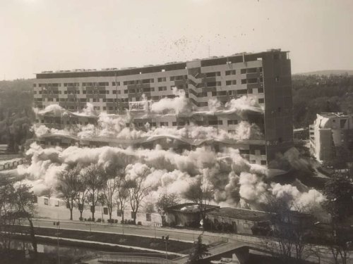 5 – Pousser à un effondrement : la détérioration immanente à la matière utilisée, qui provoque le vide ou le creux ou la destruction, qui oblige à remplacer (toute architecture est finie, non seulement elle porte en elle sa destruction (tout doit mourir) mais aussi sa transformation) ; mais aussi le destin conceptuel des immeubles-barres de la Reconstruction autour des années 1970, désormais persona non grata (non sans poser de problèmes relativement aux habitants, leur mémoire, etc.).