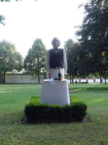 Posé dans des endroits inattendus, c’est-à-dire dans lesquels il ne viendrait pas à l’idée de s’installer pour un « pic-nic », ce serveur en tenue apparaît comme une sorte de statue. Il se doit donc, statue qu’il semble être, de rester insensible à ce qui l’environne, gens qui passent, temps qui se gâte, chien qui jappe, gens qui le regardent de près. Il n’est cependant ni de marbre ni de sel. Le temps de sa présence n’est donc ni celui de l’après catastrophe biblique, ni celui de l’intemporalité de la beauté grecque figée dans la pierre. Son temps est celui des hommes en ce qu’ils sont transportés de maintenant à plus tard par ce phénomène irrésistiblement sensible, charnel et inconditionnellement abstrait qu’est l’attente.
