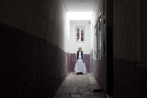 Jean-Daniel Berclaz a réalisé un ensemble d’images d’un homme en tenue de serveur, debout, devant une petite table dressée pour une collation festive, avec champagne. Il faut d’entrée noter que l’on ignore tout du reste, quels seront les plats ni si jamais ils seront servis. Il est débout, statue inattendue, semblant avoir été posté là par d’invisibles commanditaires dans l’attente des deux convives, car il n’y a que deux verres sur la table.