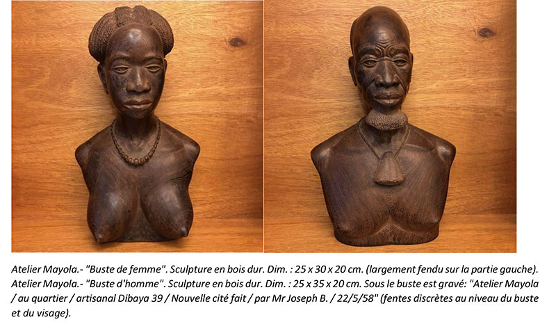 Quoi qu’en dise Marion Johnson, à ce même moment en 1952 une notule de la revue Brousse, éditée par les Amis de l’Art Indigène, dresse le bilan du Salon des Arts Indigènes de Léopoldville. On y apprend que pour la sculpture sur bois, ce fut Mayola qui remporta l’épreuve avec un beau buste en wengé. Un de ces bustes typiques qu’il taillait déjà dans les années 1930, mais dont il avait perfectionné le modèle et les finitions jusqu’à obtenir des sculptures d’un académisme rigoureux, à l’expression grave, aux coiffures sophistiquées, à la finition soignée, au polissage méticuleux. Des bustes qui n’avaient plus rien à envier techniquement aux bustes classiques antiques.