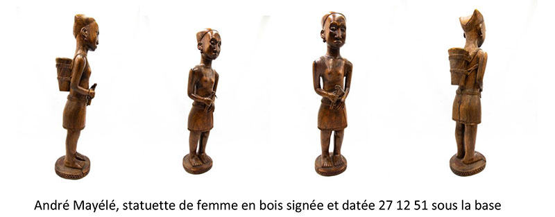 L’objet de cet article est de rendre public ce corpus d’œuvres, pour maigre qu’il soit encore, afin qu’elles permettent à tout un chacun de reconnaître Mayola et d’identifier clairement ses créations, qui n’ont encore été référencées nulle part. Tous les jours en France passent en salle des ventes des œuvres appartenant à cette école du Congo Brazzaville, de Kingoma précisément. On en trouve également un grand nombre chez les antiquaires et les brocanteurs. Davantage encore sommeillent dans les caves et les greniers de la descendance des coloniaux. Car la production de l’école de Mayola a commencé à être considérable à partir des années cinquante. A l’époque la sculpture nourrissait son homme au Congo. Mayola a signé ses œuvres à partir des années 1930, il a été actif jusqu’à la fin des années 1950, et ne vivait que de la vente de son art. Si on envisage une centaine de statuettes signées produites par an, ce qui semble un minimum, on arrive à plusieurs milliers d’objets. Beaucoup n’ont pas dû nous parvenir, mais toutes n’ont certainement pas disparu. Dans les années à venir ses œuvres vont continuer à réapparaître, surtout de petites pièces mais aussi certainement des pièces importantes. Le sculpteur reste mystérieux mais on finira par bien le connaître.
