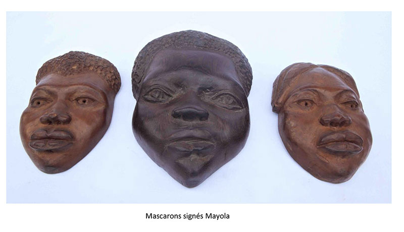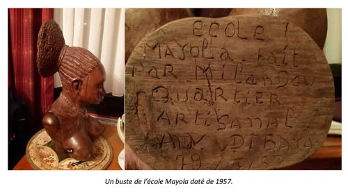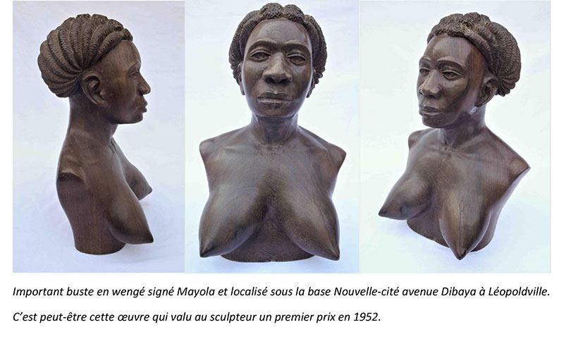 Mayola arrive donc à Kinshasa au milieu des années 1940, alors que des sculpteurs comme Ntonio, Niamba Loemba ou bien encore Daniel Futi commencent à produire des bustes académiques d’une certaine qualité expressive et naturaliste, mais souvent dépourvus de personnalité. En 1952 il remporte le premier prix de sculpture sur bois au Salon des Arts Indigènes de Léopoldville avec un buste de femme congolaise en wengé. Il est difficile d’évaluer son influence au Congo belge. C’est durant cette période charnière que Mayola ouvre son école de l’avenue Dibbaya à Nouvelle-Cité. On connaît un grand buste d’un de ses élèves représentant une femme mangbetu, avec cette inscription sous la base : école Mayola, fait par MilanDou, Quartier artisanal av Dibaya 29/2/57. Ainsi qu’une paire de bustes de l’atelier Mayola datés de 1958. Ensuite plus rien. La date nous permet de savoir que Mayola vécut au moins jusqu’en 1958. Tandis que l’autre côté du fleuve, ses élèves et neveux devenaient célèbres et passaient son style à de nombreux apprentis.