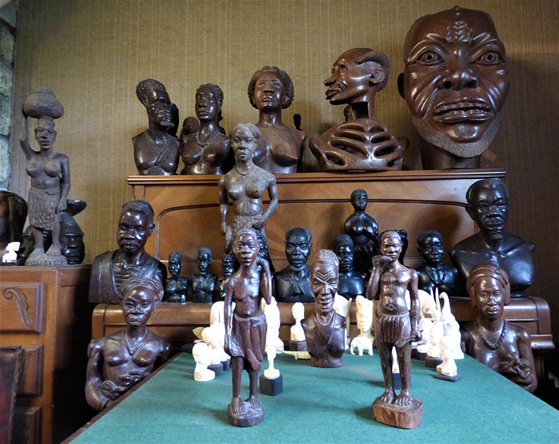 On trouve ensuite une paire de beaux visages taillés dans un bois couleur miel. Des appliques, un homme et une femme. De petite dimension, une dizaine de centimètres, il s’agit presque de miniatures. Ils sont accompagnés d’un troisième visage, plus grand, taillé dans une pièce de wengé. Ce modèle de visages caractéristiques continue d’être produit par plusieurs ateliers congolais avec des variantes. Ils ont également été reproduis en série au Cameroun dans les années soixante, puis dans d’autres pays comme le Tchad jusqu’à nos jours.