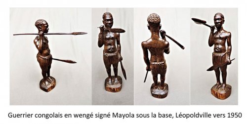 On connaît une autre statuette de guerrier en wengé signé Mayola, sensiblement de mêmes dimensions mais qui date des années 1950 alors qu’il était installé de l’autre côté du fleuve à Léopoldville. Le style du sculpteur s’est épanoui dans les détails et les proportions sont plus réalistes, la tête est moins grosse par rapport au corps. Deux décennies doivent bien séparer ces deux guerriers.